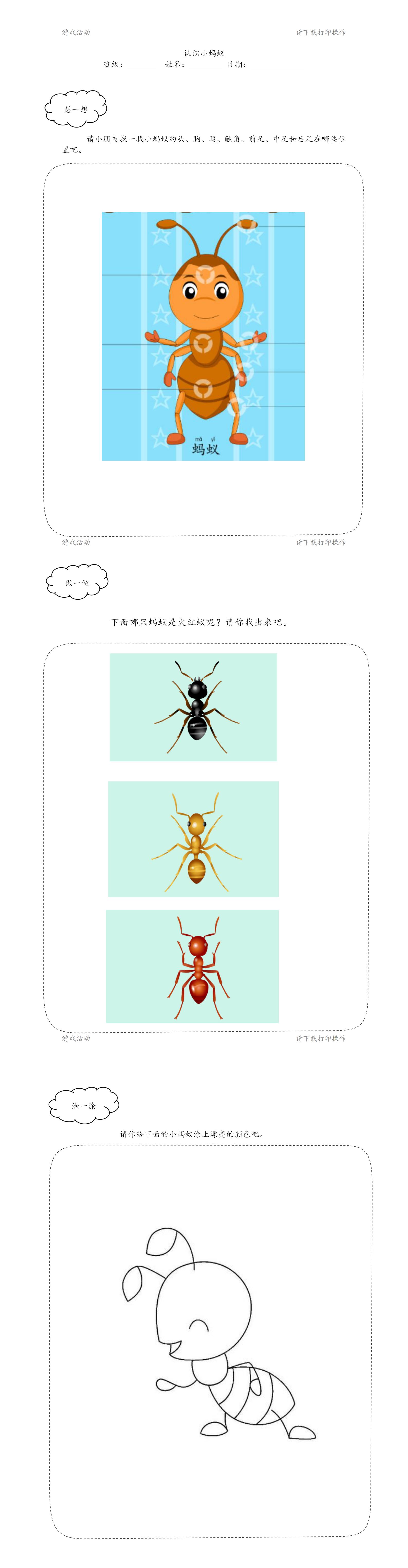 活动延伸:鼓励幼儿在路边和花园里多去观察小蚂蚁的特征。